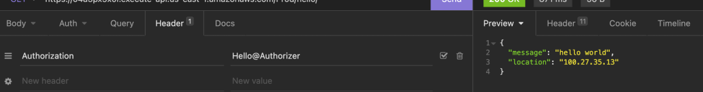 In my example, I will keep my validation really simple (not to deviate from the topic). I’ll validate the request header “authorization” against a string value “Hello@Authorizer”. If the header value is not equal to this string, then deny the all calls towards the REST Api.